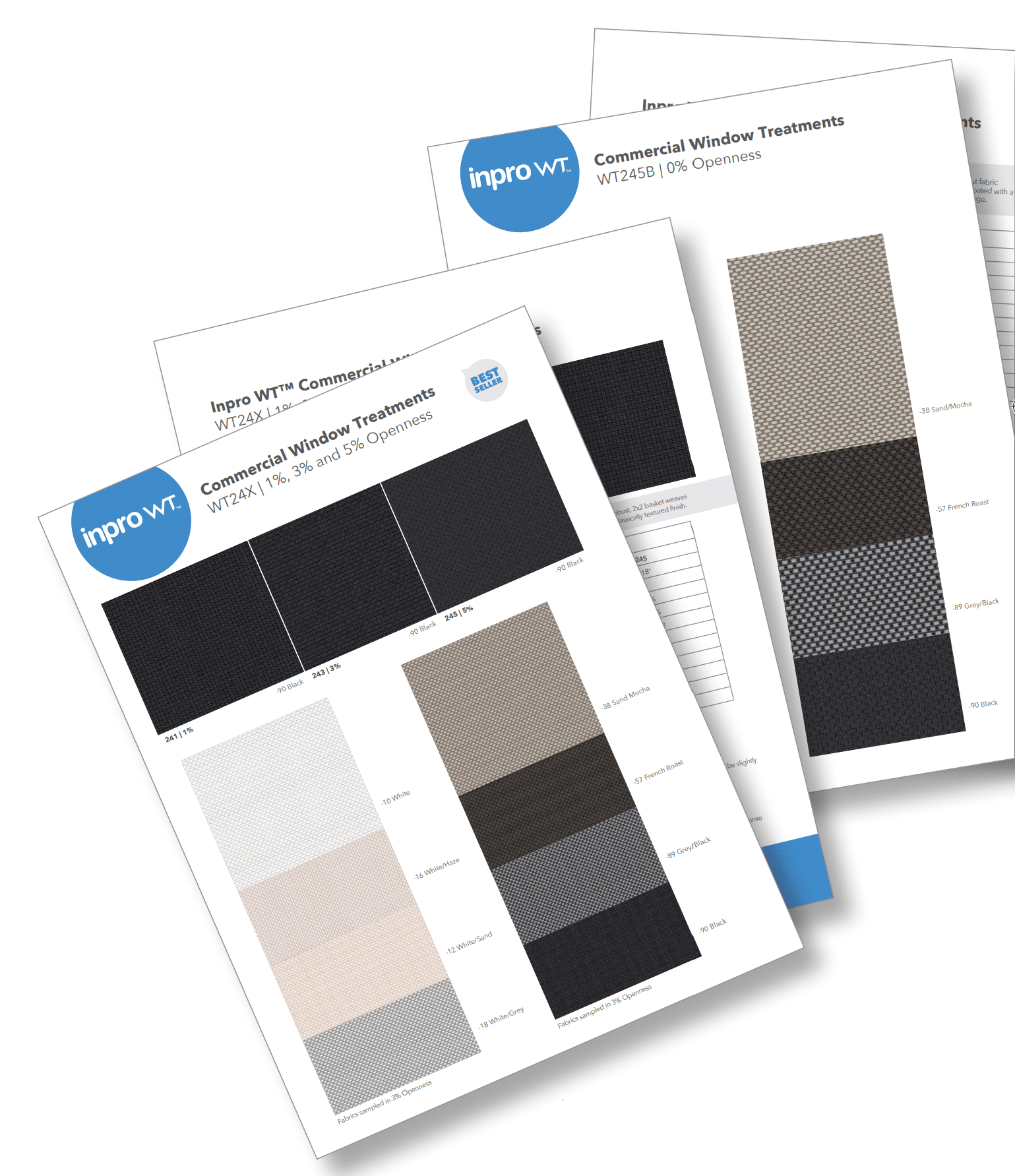 Explore the full range of Inpro WT fabrics for roller shades with our sample cards. Each card highlights our fabric options, showcasing a variety of colors and openness levels. Perfect for architects, designers, contractors, and dealers looking to enhance their projects with stylish and functional window treatments.