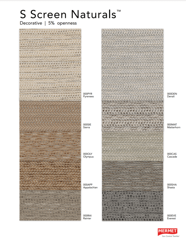 Uses the same wrapped yarn bundles as the flagship S Screen™ line. Constructed with a unique fancy weave pattern and includes a new clear yarn providing a luster to the texture and enhancing the effect of natural daylighting. This is a sample card that showcases a comprehensive palette, featuring all available colors for this product.