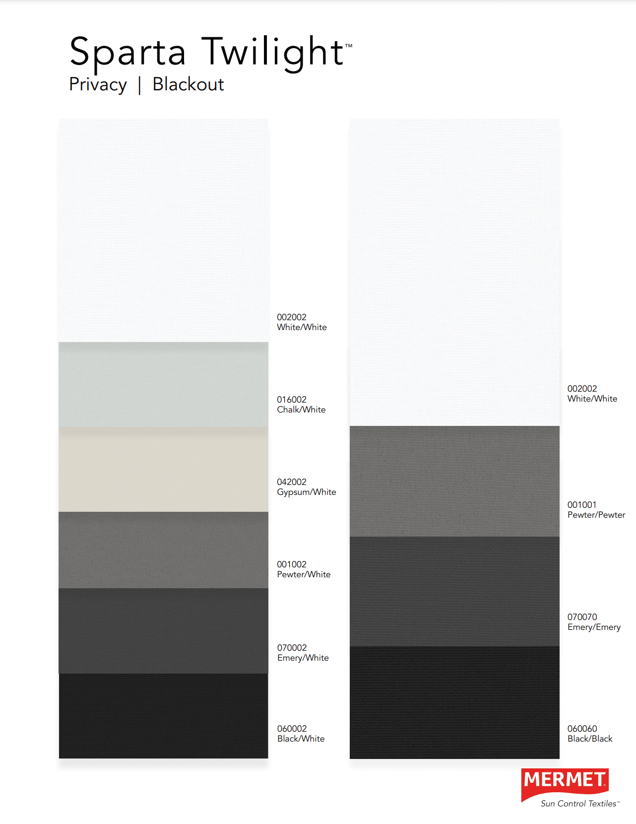 A classic blackout fabric composed of 100% polyester with an acrylic foam coating. Sparta Twilight™ provides complete privacy. This is a sample card that showcases a comprehensive palette, featuring all available colors for this product.