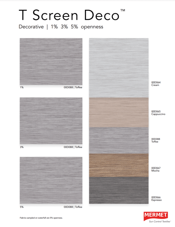 A vinyl coated fiberglass fabric with a satin weave pattern and a unique style, texture and color. This distinctive fabric has a dual-sided, highly reflective white backing for thermal control and a bicolor woven face for indoor aesthetics. This is a sample card that showcases a comprehensive palette, featuring all available colors for this product.