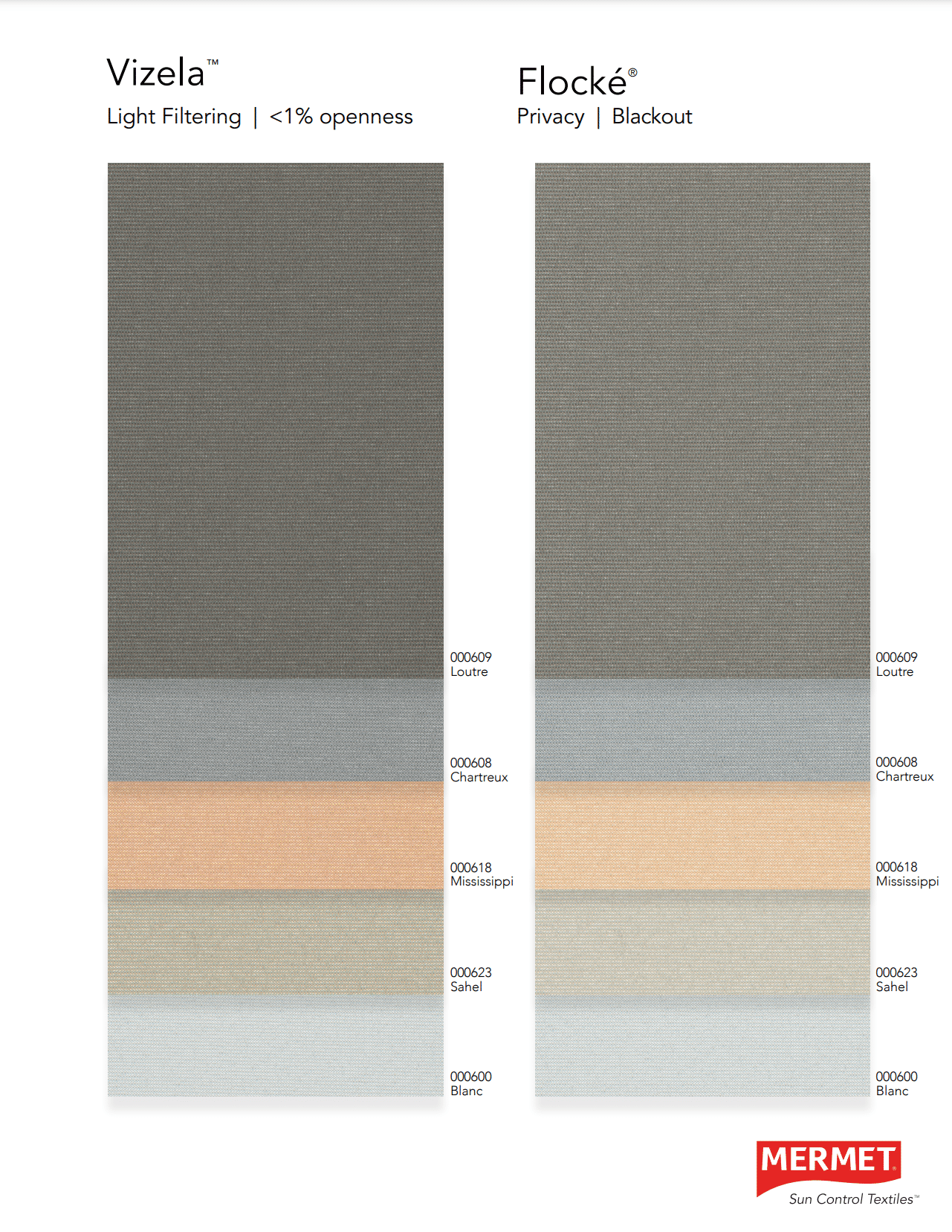 Flocké® is a blackout fabric constructed with 100% textured fiberglass and a soft acrylic cotton flock backing. Provides complete privacy. Pair with Vizela™, for both privacy and natural daylighting. This is a sample card that showcases a comprehensive palette, featuring all available colors for this product.