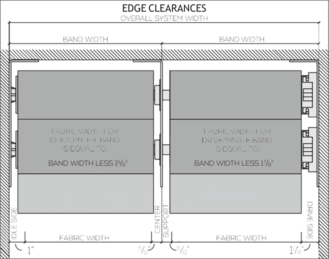 Optional: CENTER SUPPORT (INCLUDES CENTER SUPPORT BRACKET, TANGS, AND FORKS) Coupled option available up to 6 bands. Can be Ceiling or Wall Mounted. Drive Right or Drive Left.