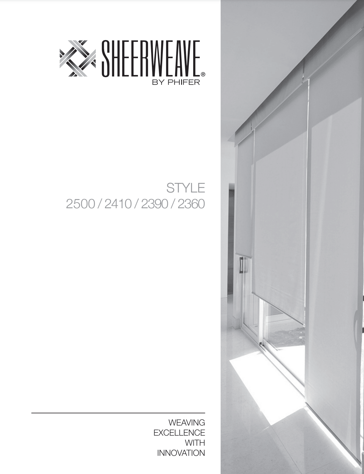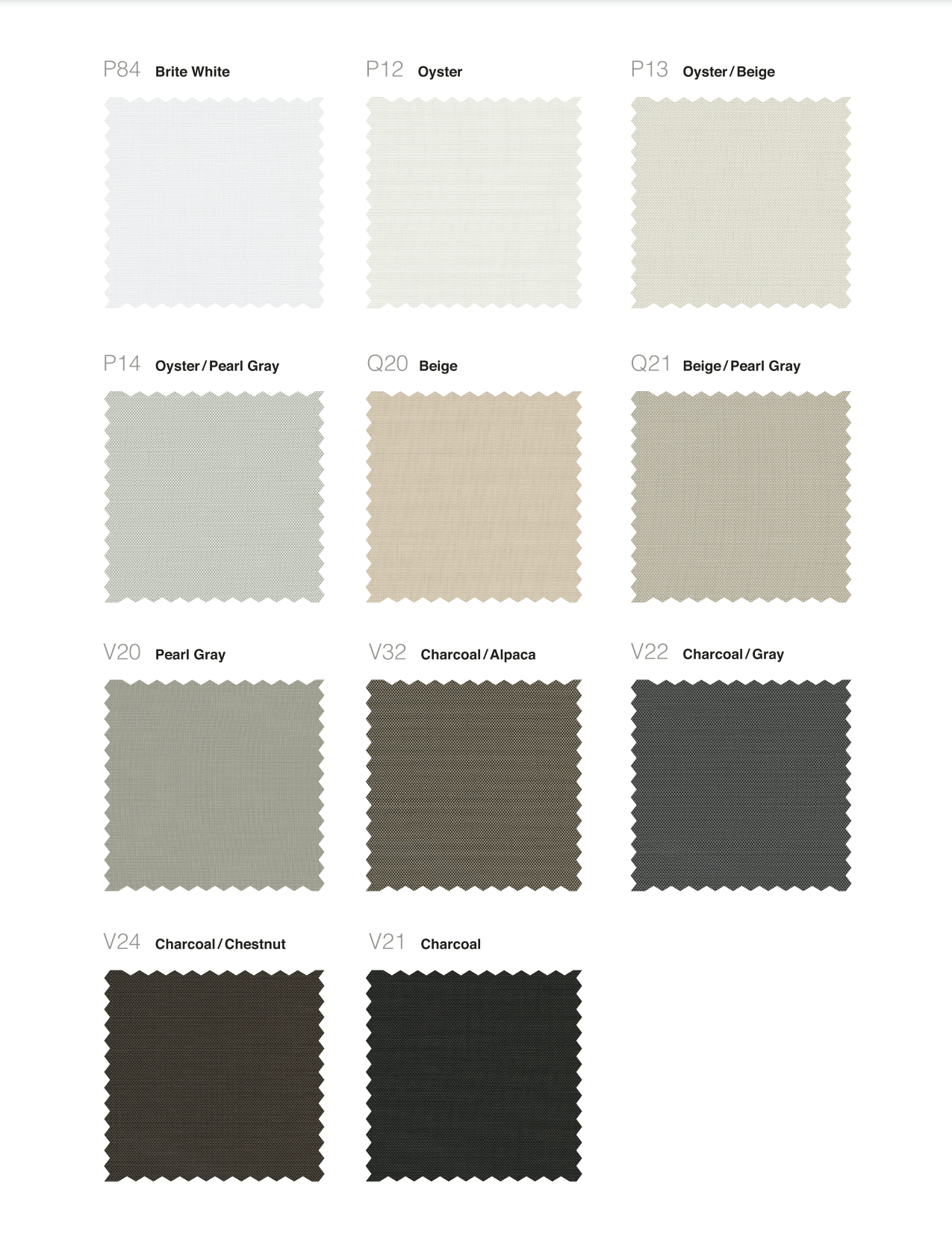 Whether you need interior or exterior shades, learn more about SheerWeave 2500, 2410, 2390 and 2360. The lightweight, vinyl-coated fiberglass fabrics provide the broadest range of performance in a non-directional fabric. This is a sample card that showcases a comprehensive palette, featuring all available colors for this product.