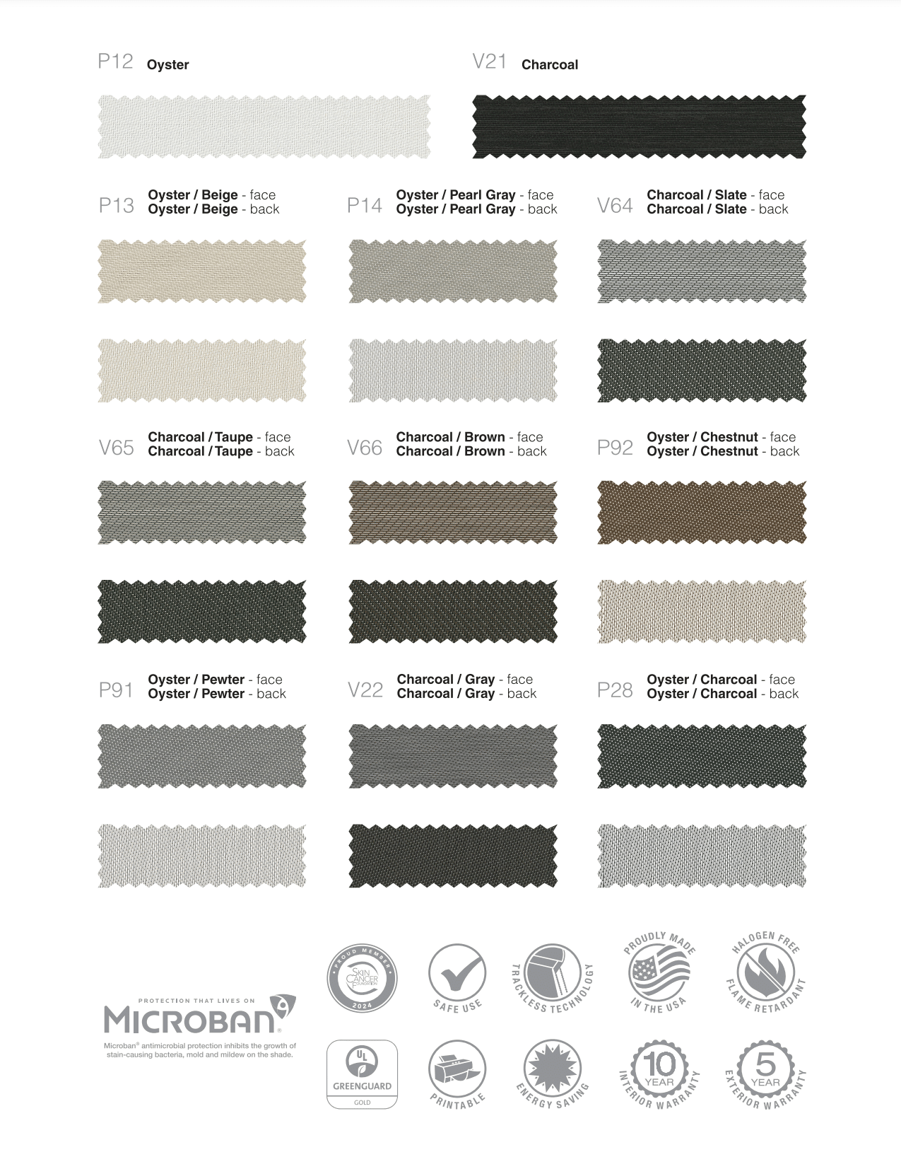 SheerWeave 2701, 2703, 2705 and 2710 offer excellent heat-reduction benefits and glare reduction. The two-sided fabrics can be used for both all applications. This is a sample card that showcases a comprehensive palette, featuring all available colors for this product.