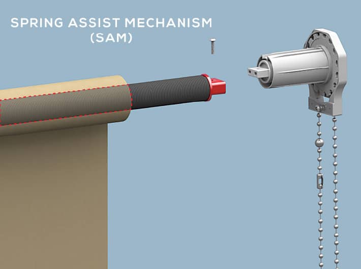 Operating a Manual Shade by pulling the Drive Chain may require significant effort, and upgrading to motorization can become expensive. With our Spring Assist Mechanism (SAM) you can have a cost-effective option for operating even the largest shades with ease. Mounted inside the tube and attached to the clutch, this pre-wound spring can reduce the required pulling force necessary to operate the shade by up to 50%. With the Inpro SAM, operating your shades has never been easier!
