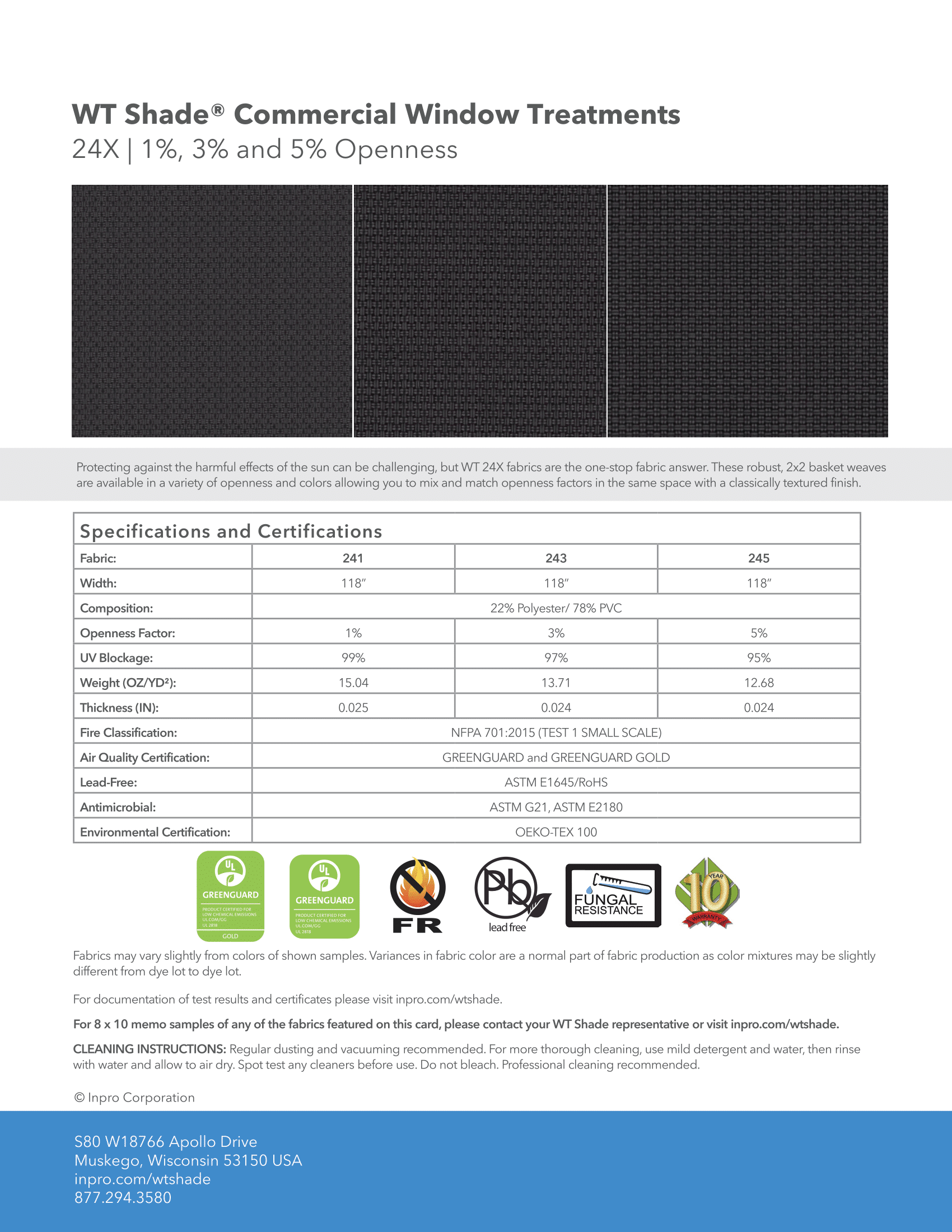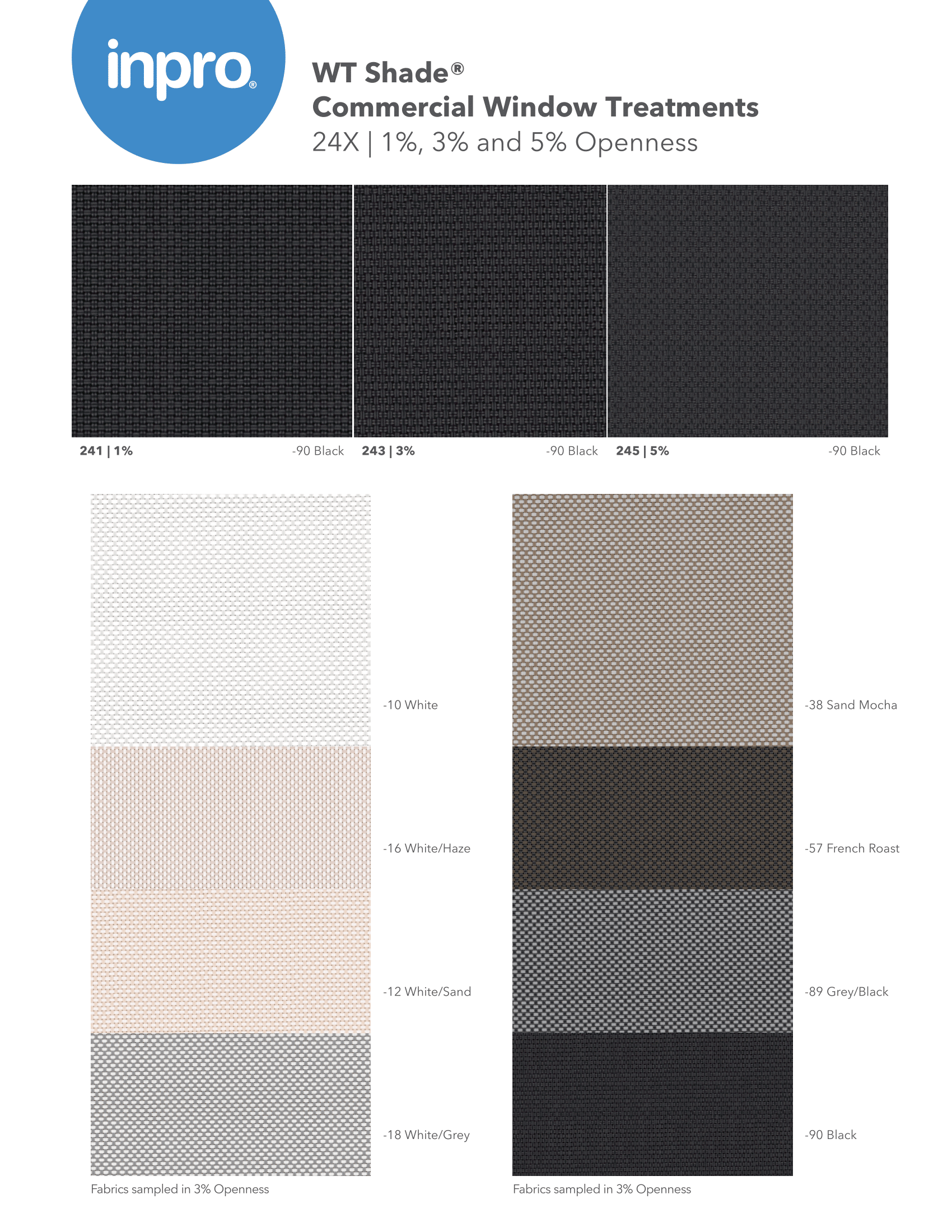 Protecting against the harmful effects of the sun can be challenging, but WT 24X fabrics are the one-stop fabric answer. These robust, 2×2 basket weaves are available in a variety of openness and colors allowing you to mix and match openness factors in the same space with a classically textured finish. This is a sample card that showcases a comprehensive palette, featuring all available colors and openness for this product.