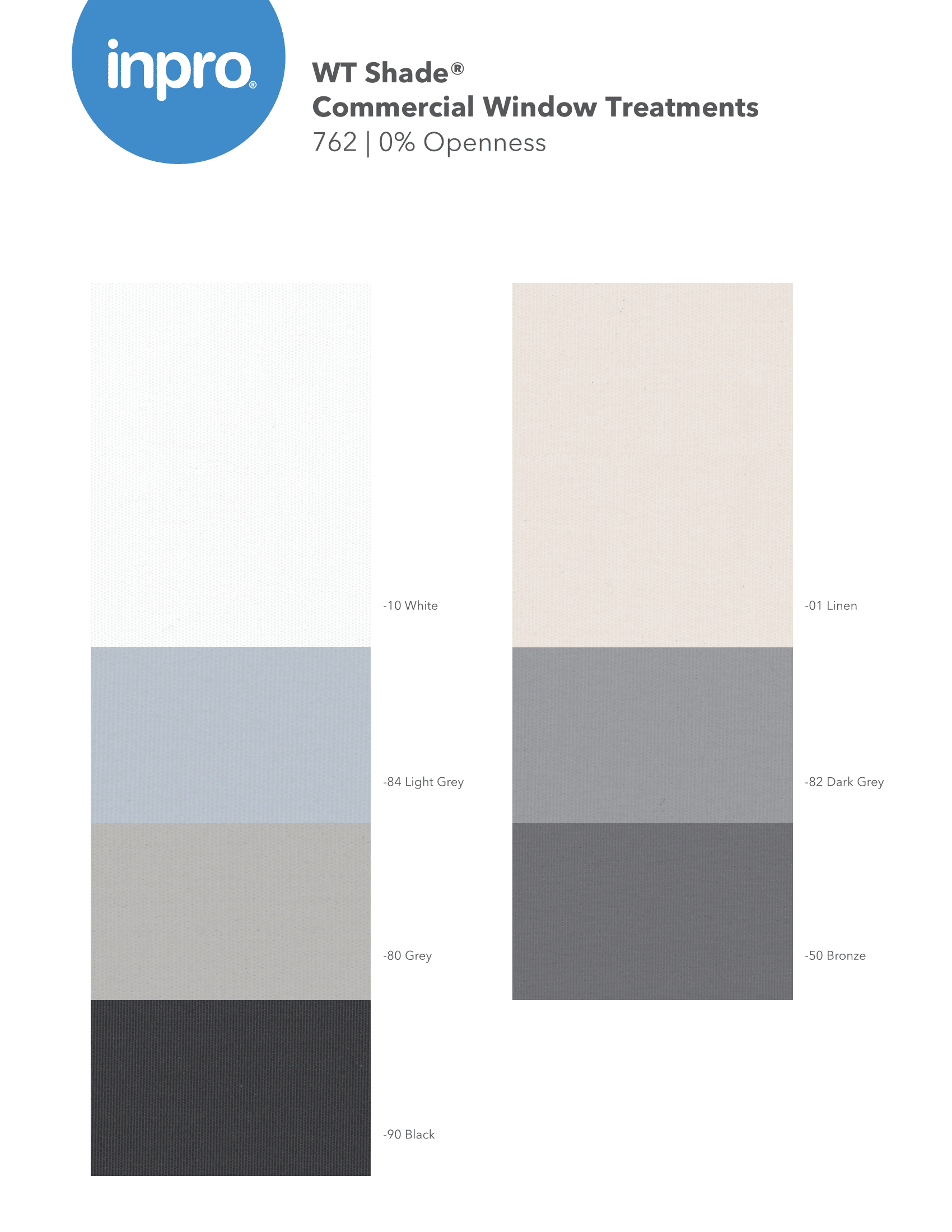 WT 762 is an attractive, medium weight blackout material that is available in a wonderful 7 color palette. The material is PVC free and is perfect for any light blocking needs. All colors have a white backing to help with additional protection against heat gain. This is a sample card that showcases a comprehensive palette, featuring all available colors and openness for this product.