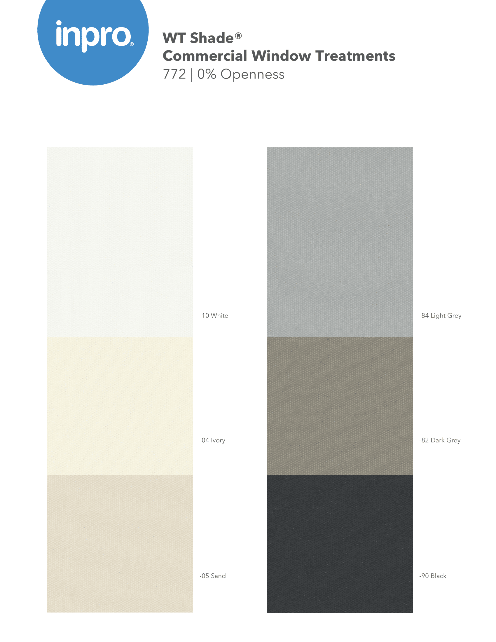 For an elegant blackout solution look no further than WT 772. This beautiful PVC free fabric’s white backing offers additional protection against heat gain and provides energy savings. The soft hand and textured appearance creates a luxurious look. This is a sample card that showcases a comprehensive palette, featuring all available colors and openness for this product.